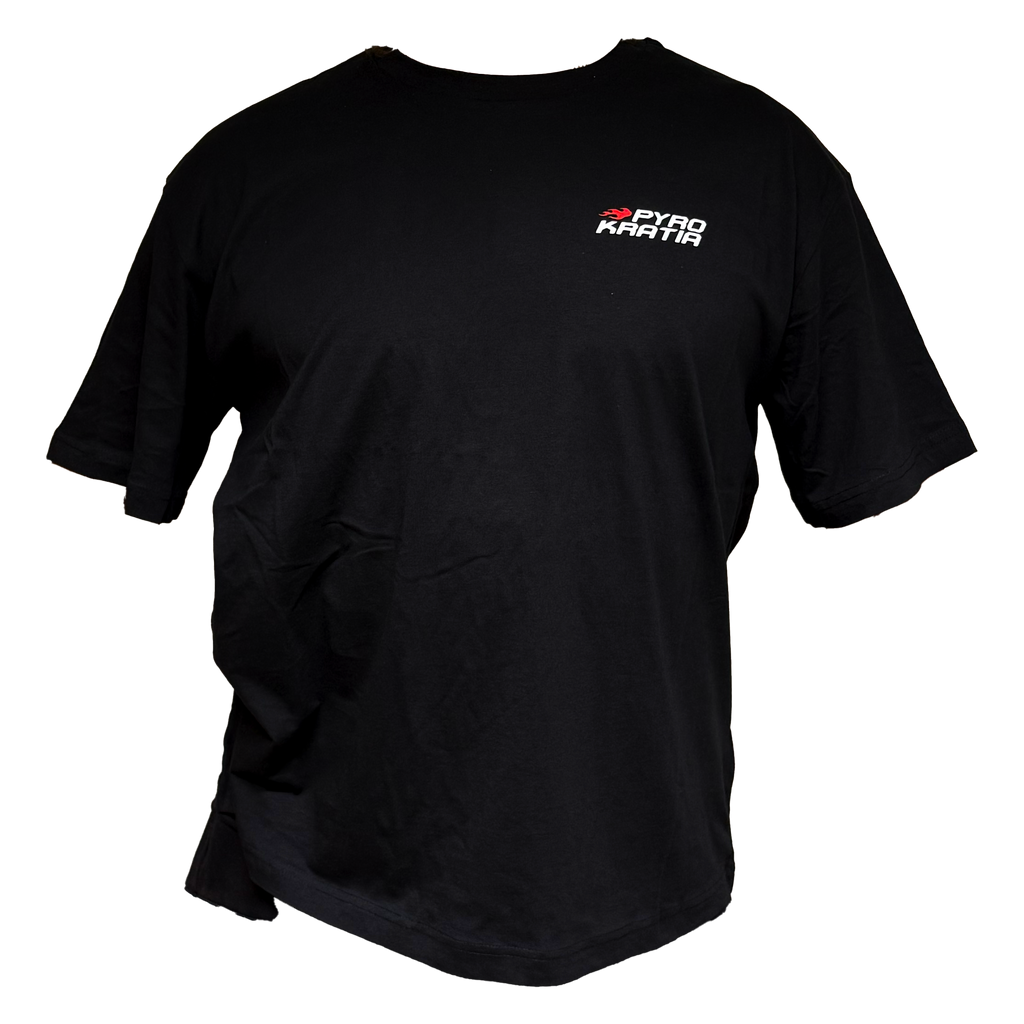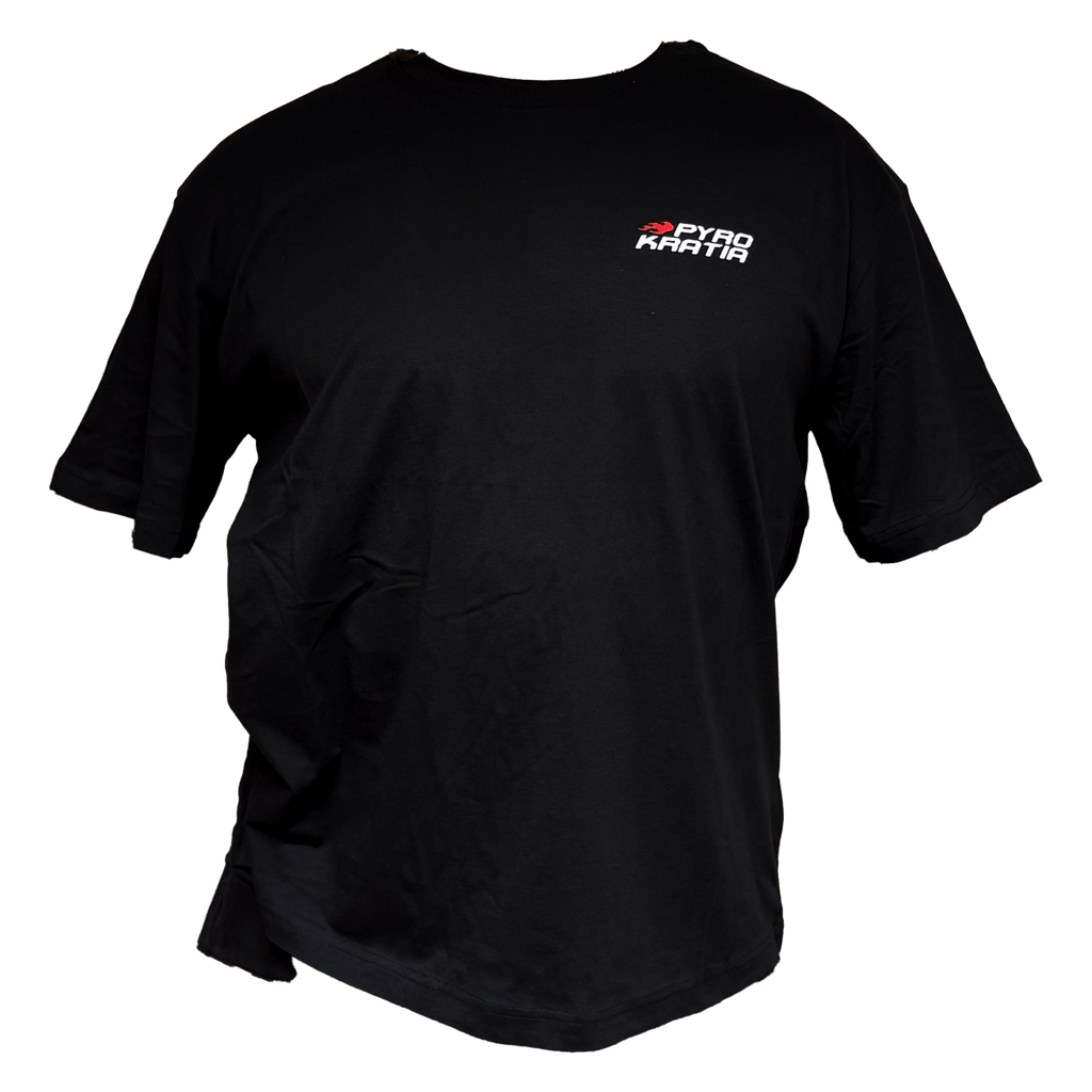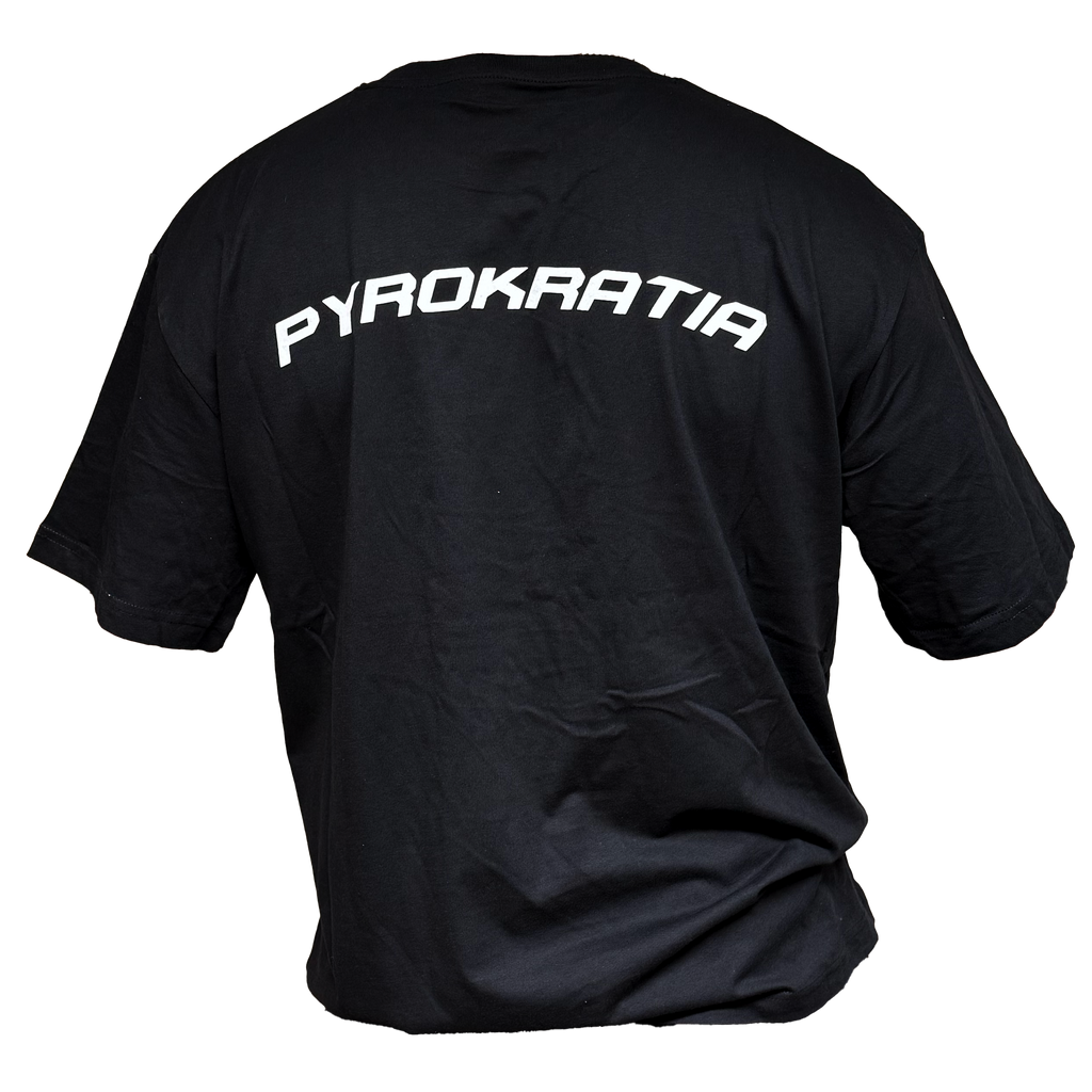 Pyrokratian uudistettu t-paita on jälleen mukavantuntuisesta kankaasta valmistettu paita. Edessä liekinkanssa varustettu Pyrokratia teksti ja selässä liekitön teksti.