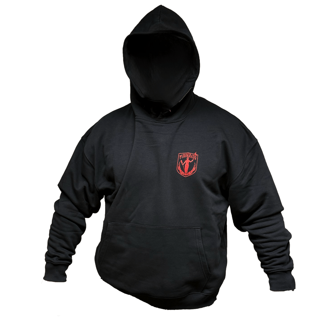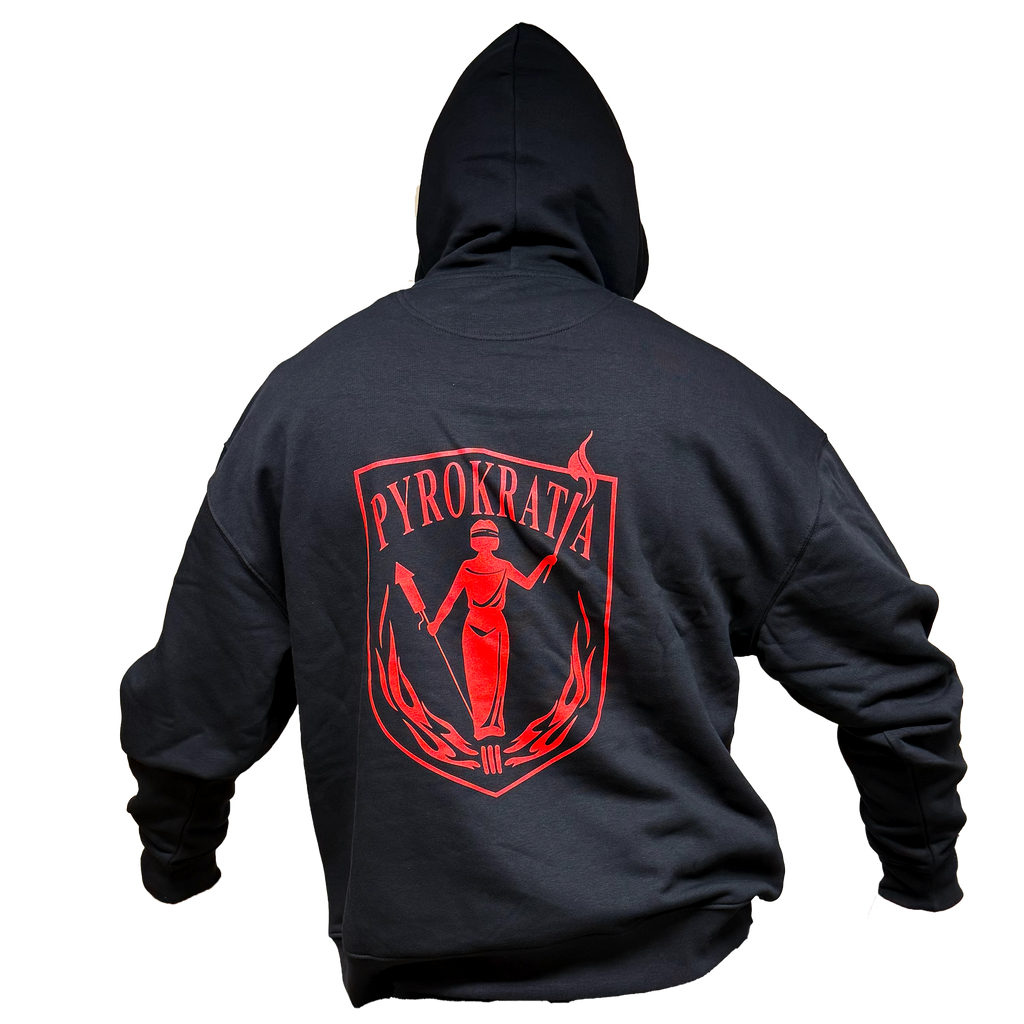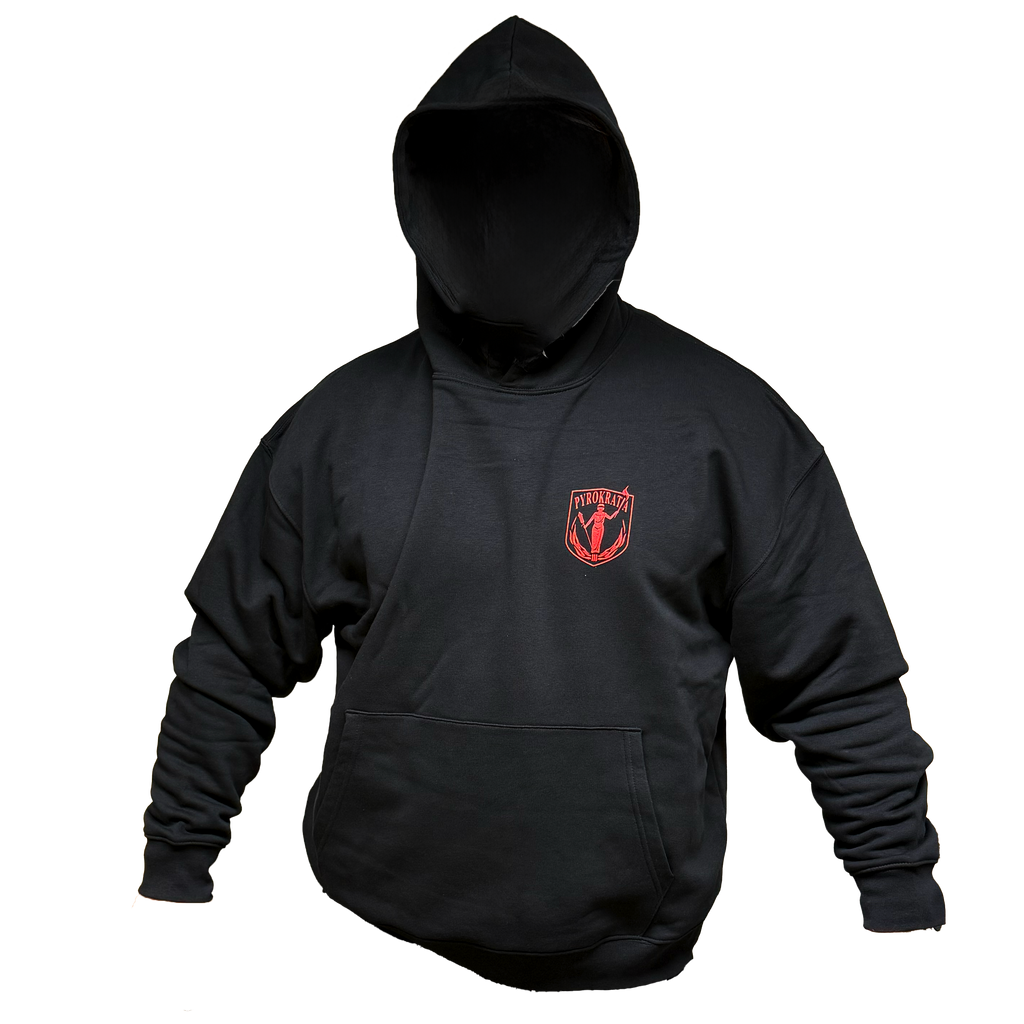 Pyrokratian uudistettu -huppari on laadukkaasta kankaasta valmistettu vuorellinen huppari, joka lämmittää, vaikka pankkitilin saldo kylmäisi sielua. Etupuolella rinnassa on punainen printtilogo ja selässä ISO punainen logo. Edessä tasku.