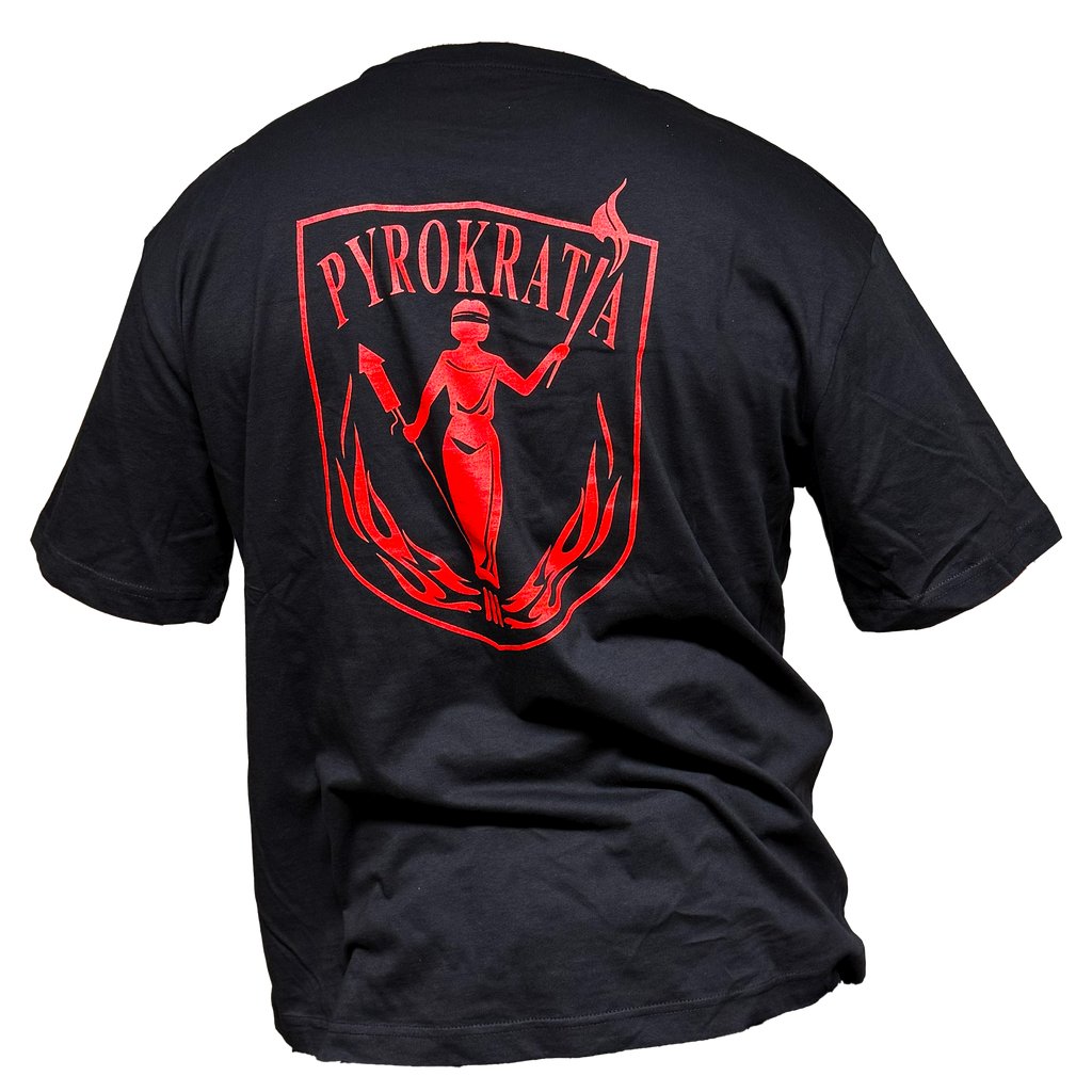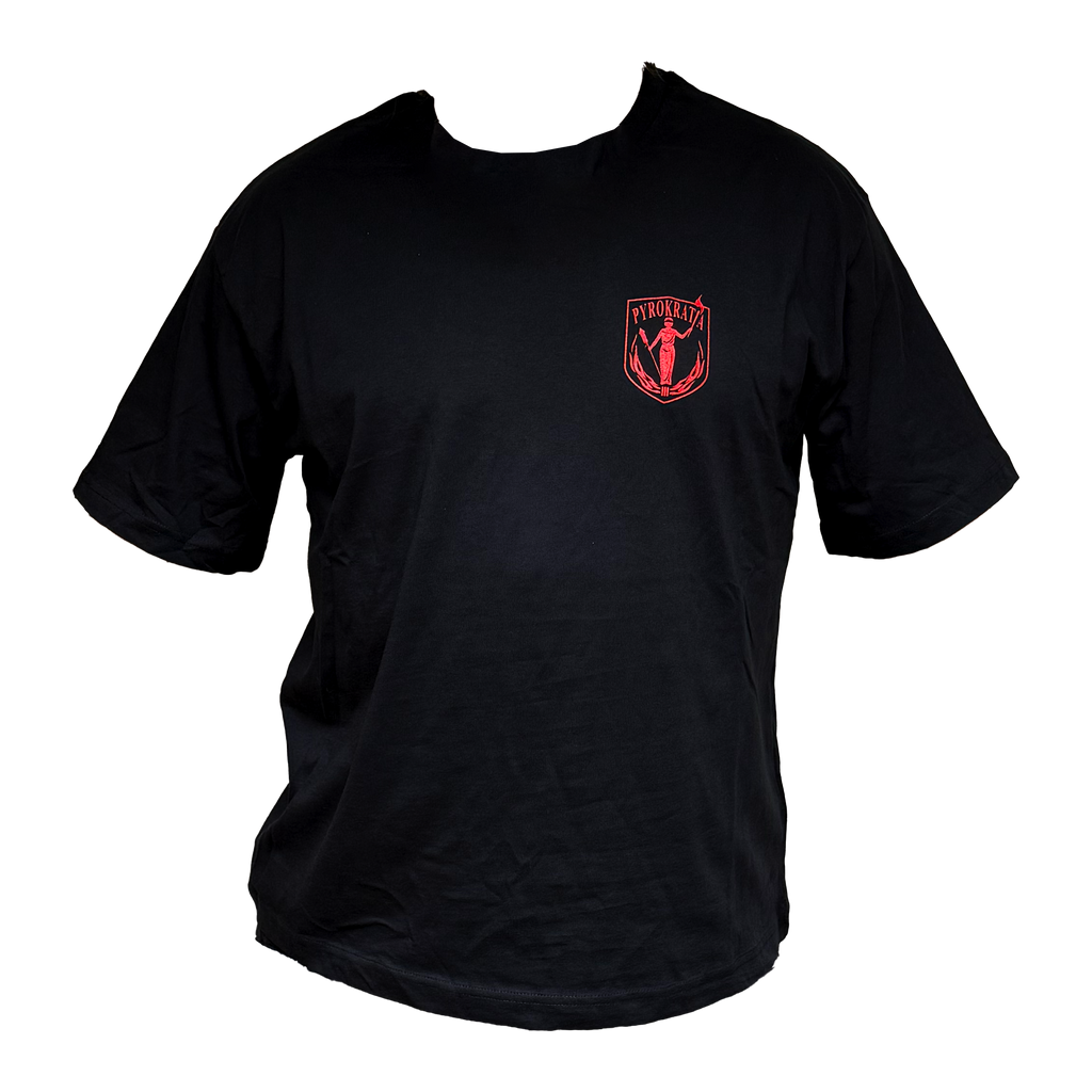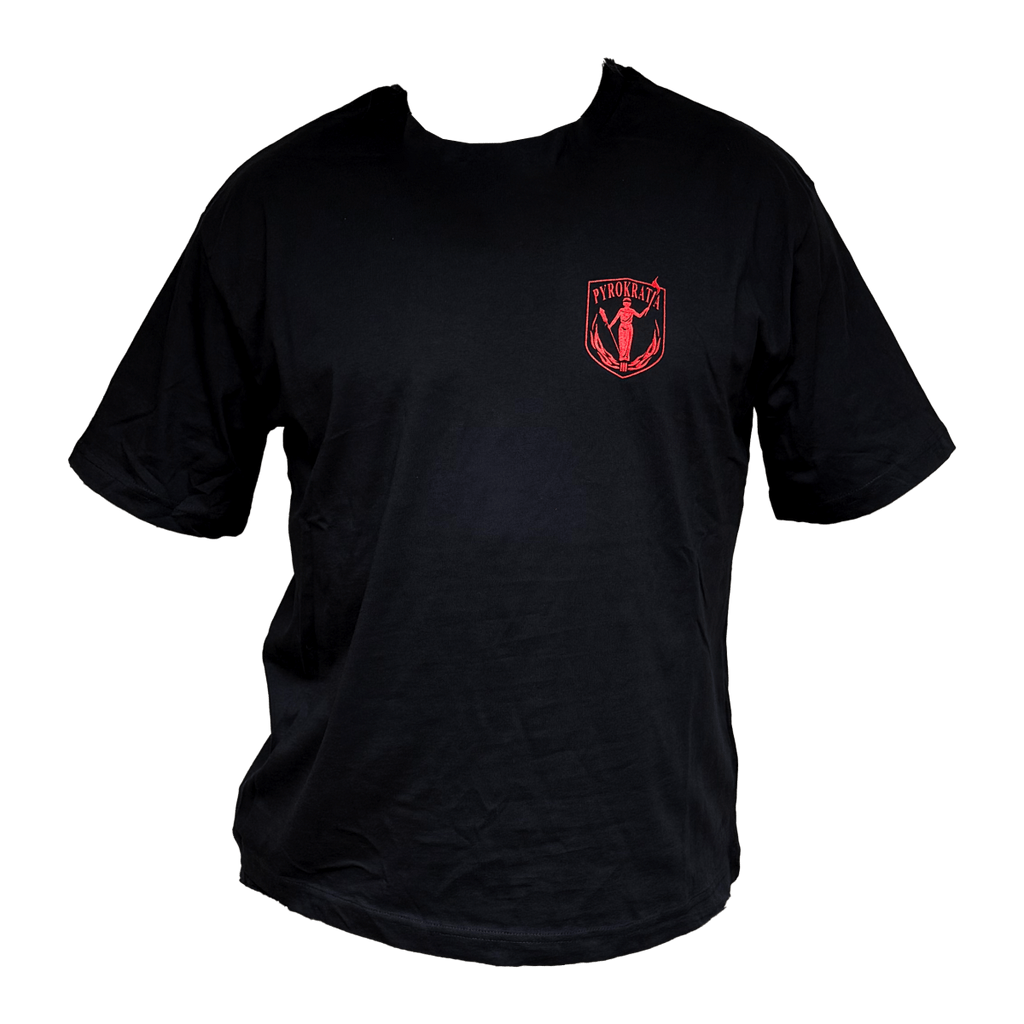 Pyrokratian uudistettu t-paita on jälleen mukavantuntuisesta kankaasta valmistettu paita. Edessä punainen Pyrokratia logo ja selässä ISO punainen logo.