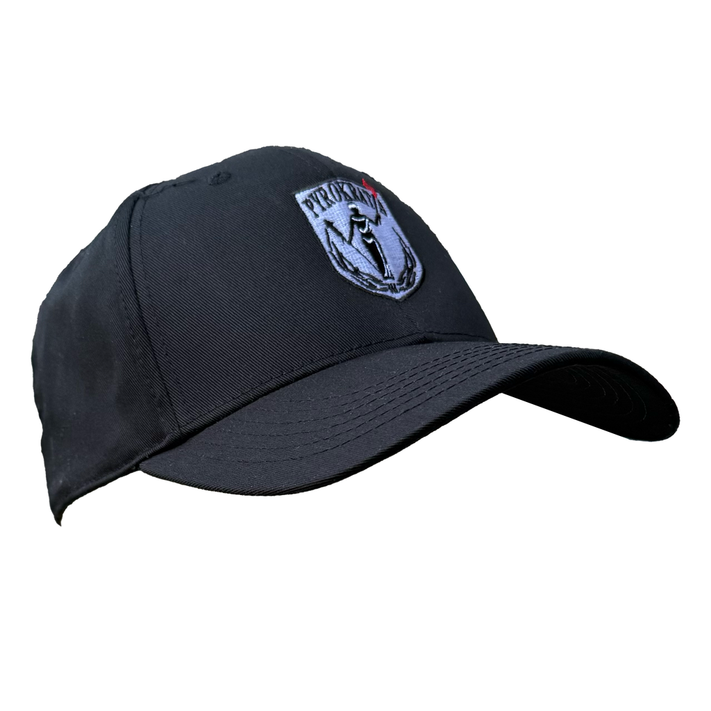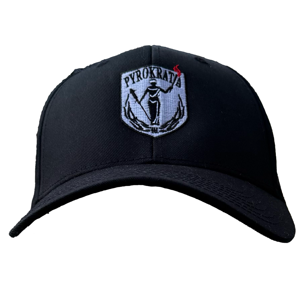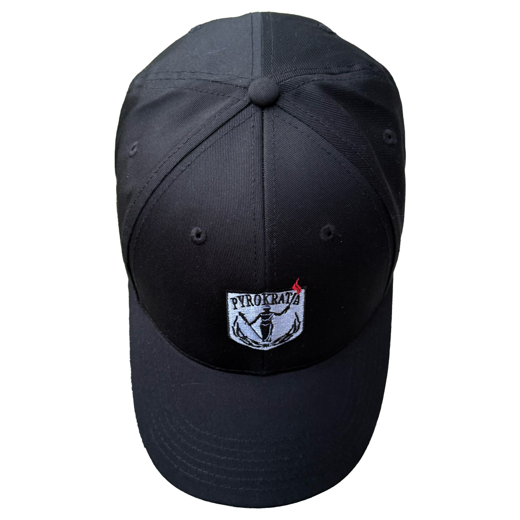 Musta perinteinen lippalakki brodeeratulla Pyrokratia logolla. Kokoa voidaan säätää omaan nuppiin sopivaksi takaa löytyvällä tarralla.